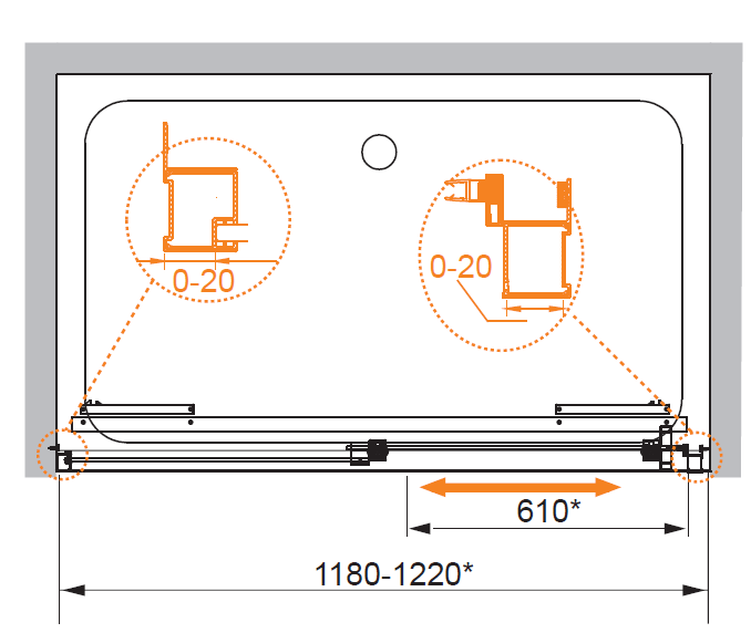 Дверь надежно фиксируется на стальных петлях с герметизирующим материалом. Боковые профили регулируют ширину в диапазоне: 1180-1220 мм.