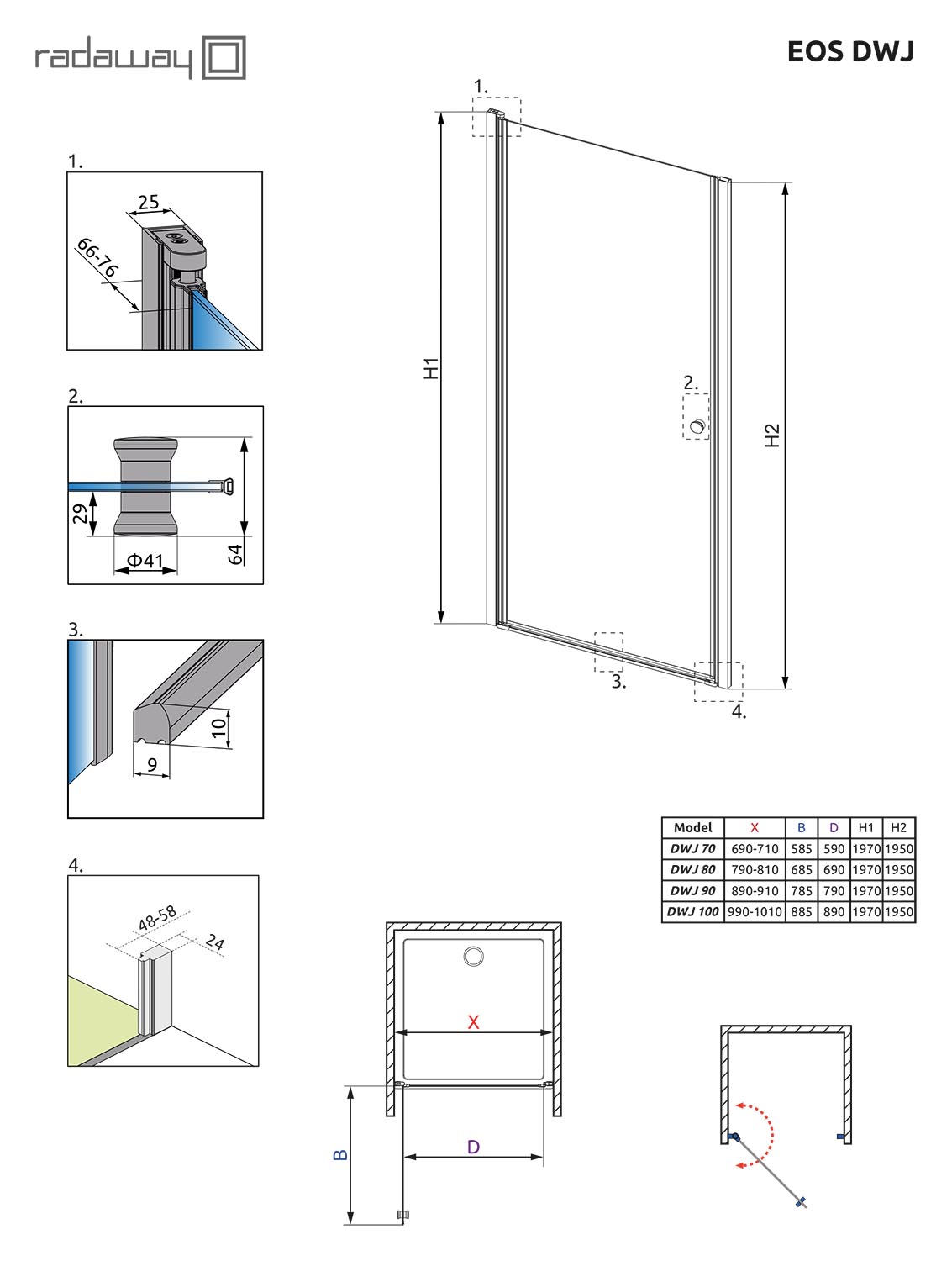 Стеклянная душевая дверь в нишу Radaway Eos DWJ 90 37903-01-01N с элегантной хромированной фурнитурой, с одной распашной створкой, открывающейся наружу и внутрь. Подходит для инвалидов. Устанавливается на поддон или непосредственно на пол. Магнитный уплотнитель обеспечивает герметичность и устойчив к влаге и изменениям температуры. Прочное закаленное стекло безопасно в случаях повреждений. Водоотталкивающее защитное покрытие Easy Clean не позволяет каплям воды удерживаться на поверхности стекла и оставлять следы.
