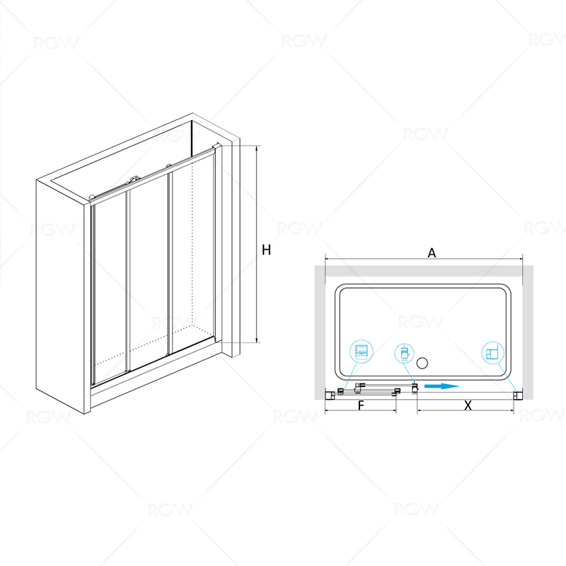Стеклянная раздвижная душевая дверь в нишу RGW Classik CL-11 100 04091100-11. Три секции: две сдвижные и одна неподвижная.