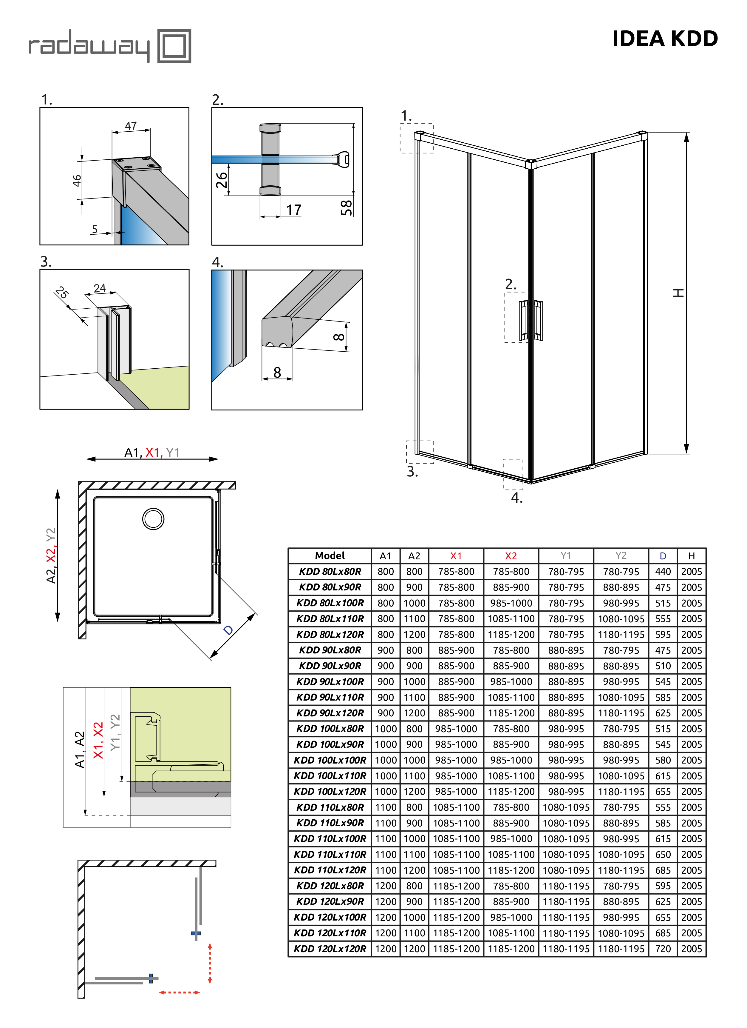 Раздвижные двери подвешены на двойных регулируемых роликах. Подшипники роликов со смазкой для надежного, тихого и плавного движения. Держатель порога можно расфиксировать для очистки стекол. Ручка и детали хромированные.