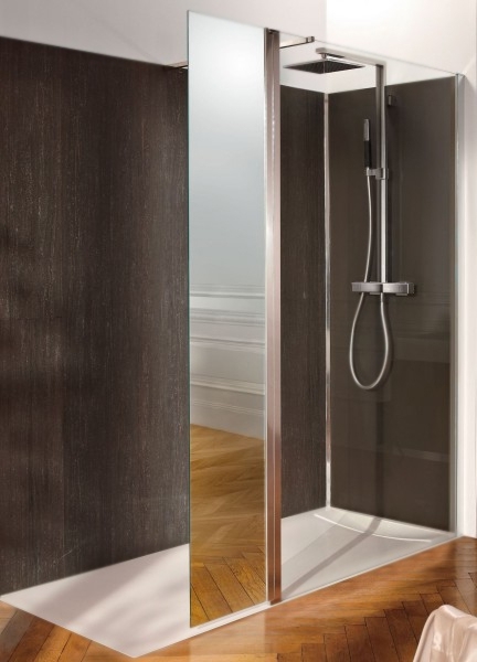 Стеклянная прозрачная фиксированная душевая перегородка с зеркальной поворотной панелью Jacob Delafon Contra 180 R C22WP140R-MZ. Поворотная панель предотвращает разбрызгивания воды. Прозрачная перегородка создает единое пространство душевой зоны и ванной комнаты. Подходит для людей с ограниченными возможностями.