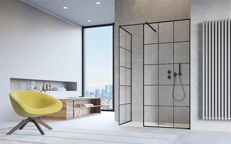 Стеклянная душевая перегородка Radaway Modo New II Factory 95 389095-54-55 типа свободный вход Walk-in надежная и комфортная, с элегантной черной фурнитурой и с черной решеткой из керамической краски на стекле. Индустриальный стиль. Подходит для людей с ограниченными возможностями. Устанавливается на поддон или непосредственно на пол. Прочное закаленное стекло безопасно в случаях повреждений. Водоотталкивающее защитное покрытие Easy Clean не позволяет каплям воды удерживаются на поверхности стекла и оставлять следы.