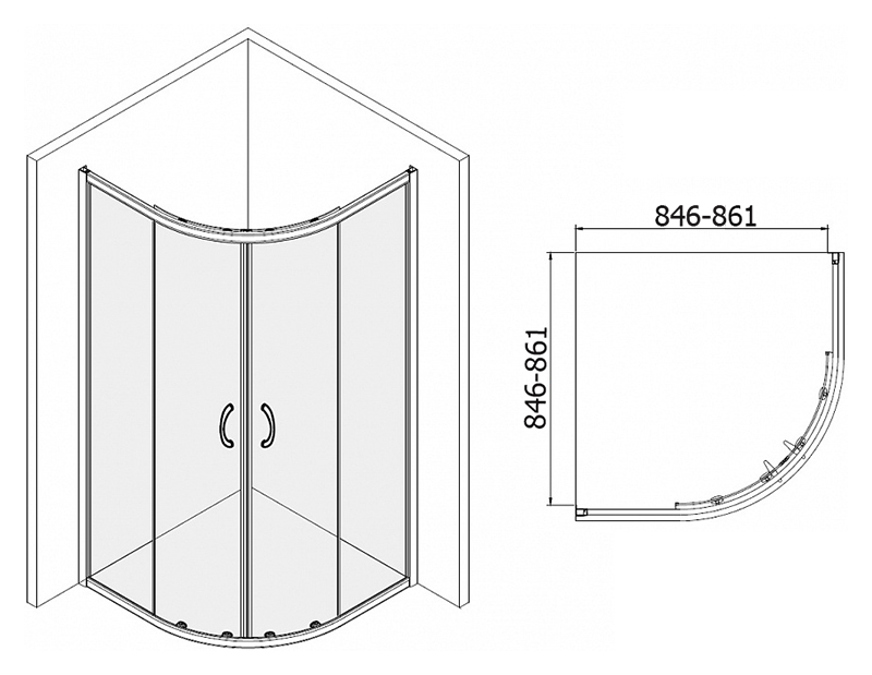 Душевой уголок Azario AZ-121S A 90x90 в форме четверть круга, высотой 1950 мм, с регулировкой по ширине, с двумя раздвижными дверцами, со стеклом толщиной 6 мм, с алюминиевым профилем цвета хром.