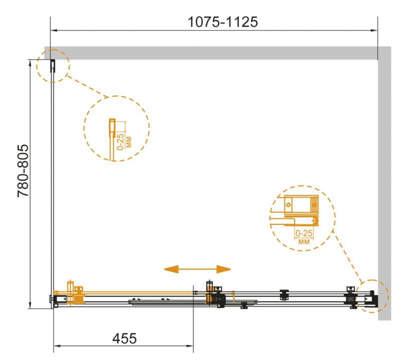 Дверь уголка имеет направляющий профиль с односторонним доводчиком. Комфортное использование обеспечивают подвижные ролики, которые плавно скользят по металлическим направляющим.