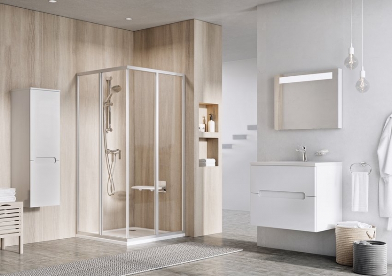 Устанавливается в облицованный кафелем угол ванной комнаты на поддон или непосредственно на пол со встроенным душевым каналом или трапом.