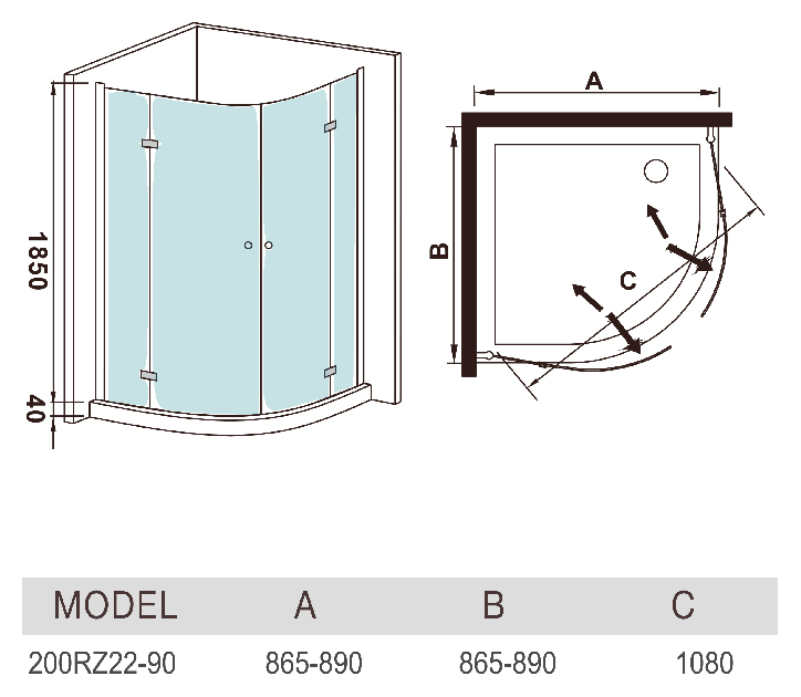 Стеклянный душевой уголок WeltWasser WW200 90x90 200RZ22-90 в форме четверти круга. Две двери складываются и поворачиваются внутрь и наружу.