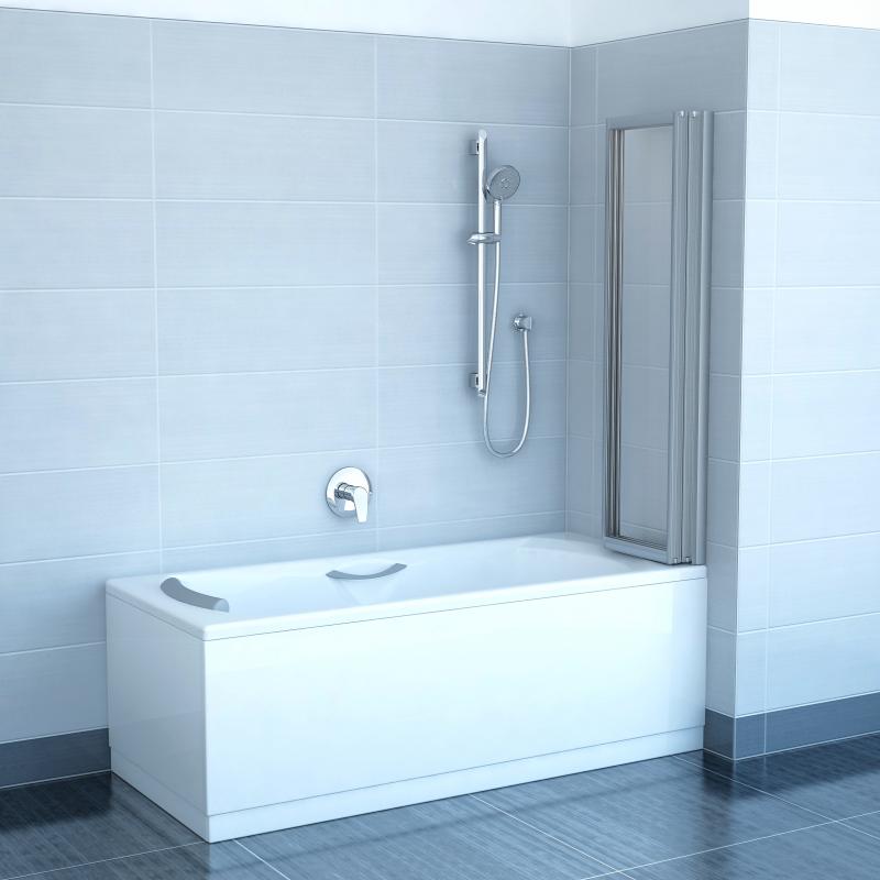 Стеклянная шторка на ванну Ravak Behappy VS3 130 795V0U00Z1 трехсекционная, состоящая из трех подвижных частей, которые складываются внутрь. Левый или правый варианты входа получаются путем разворота изделия на 180°.
