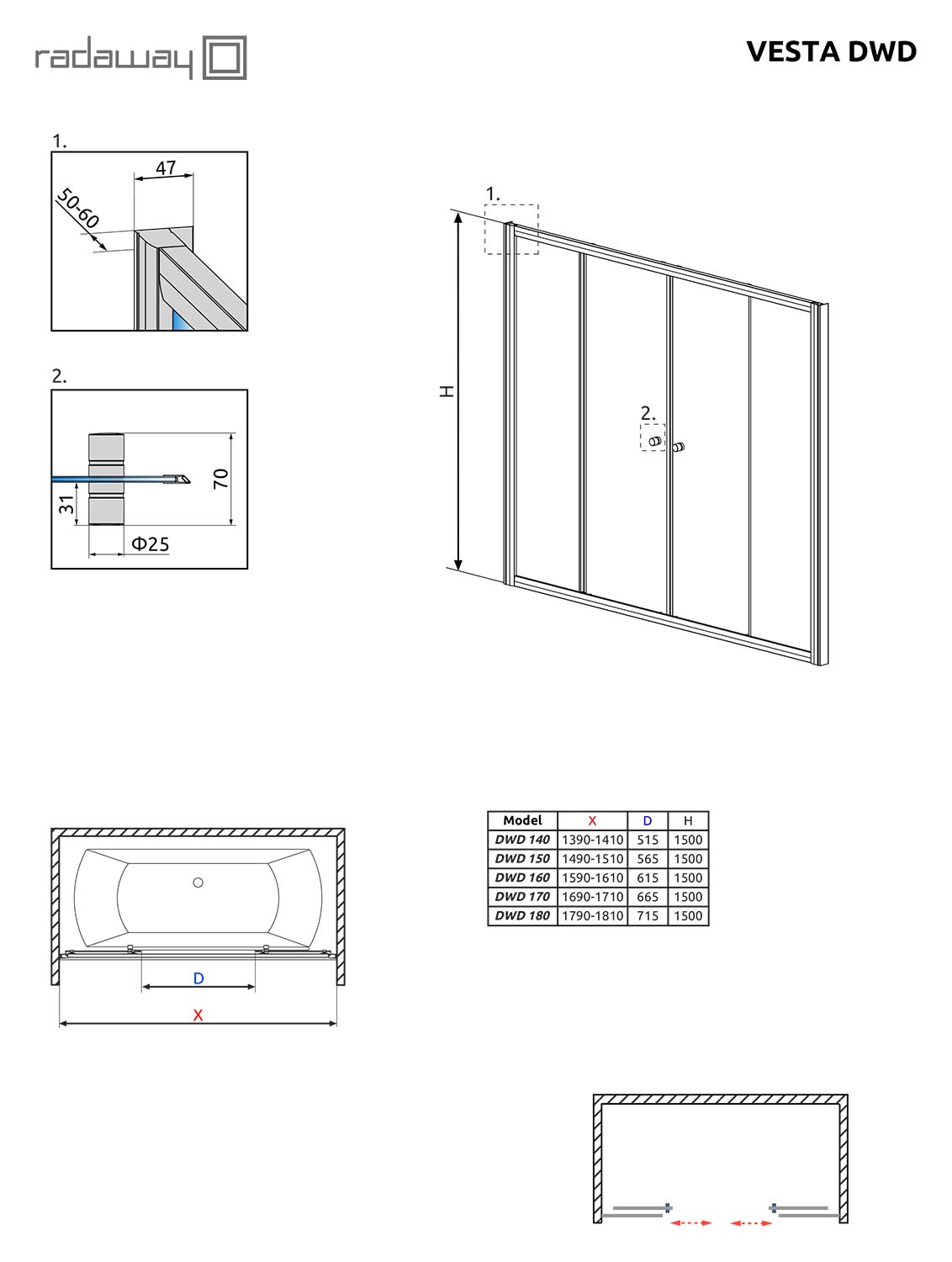 Стеклянная шторка на ванну Radaway Vesta DWD 140 203140-01 с двумя раздвижными створками, с элегантной хромированной фурнитурой. Створки двигаются плавно на двойных подшипниковых роликах. Прочное закаленное стекло безопасно в случаях повреждений. Водоотталкивающее защитное покрытие Easy Clean не позволяет каплям воды удерживаться на поверхности стекла и оставлять следы.