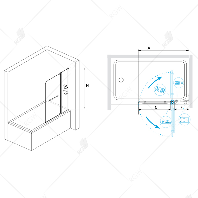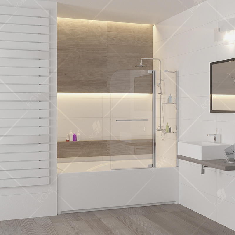 Стеклянная шторка на ванну RGW Screens SC-04 110x150 03110411-11 распашная маятниковая. Две стеклянные полочки. Широкая ручка полотенцедержатель. Универсальная установка с левой или правой стороны.