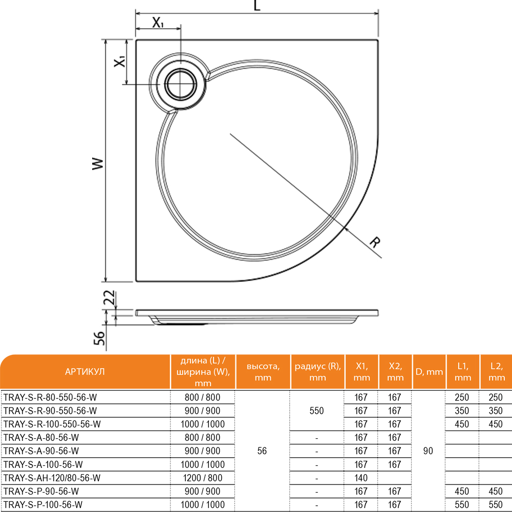 Встраиваемый литой душевой поддон из искусственного мрамора Cezares Tray S R 90x90x6 TRAY-S-R-90-550-56-W радиальный, в форме четверти круга, низкий.