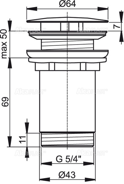 Донный клапан для умывальника Alcaplast A396 5/4 цельнометаллический с большой пробкой, для умывальников без перелива