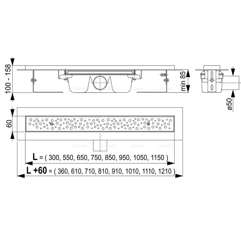 Душевой лоток AlcaPlast Antivandal APZ11-750 с решеткой и опорами используется внутри помещений для отведения воды на уровне пола, может располагаться как посреди душевой, так и у стены. Предназначен для установки перфорированной решетки. Нержавеющий порог желоба формирует визуальный переход между плиткой и вставленной решеткой. Вода втекает в желоб через края и отверстия решетки. Желоб может быть установлен на открытом участке или к стене душевой поверхности.Технические характеристики: