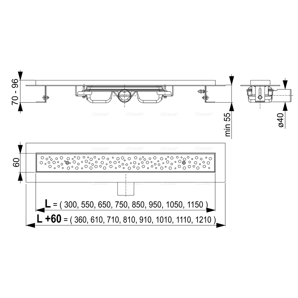 Душевой лоток AlcaPlast Low APZ111-550 с решеткой и опорами используется внутри помещений для отведения воды на уровне пола, может располагаться как посреди душевой, так и у стены. Предназначен для установки перфорированной решетки. Нержавеющий порог желоба формирует визуальный переход между плиткой и вставленной решеткой. Вода втекает в желоб через края и отверстия решетки. Желоб может быть установлен на открытом участке или к стене душевой поверхности.Технические характеристики: