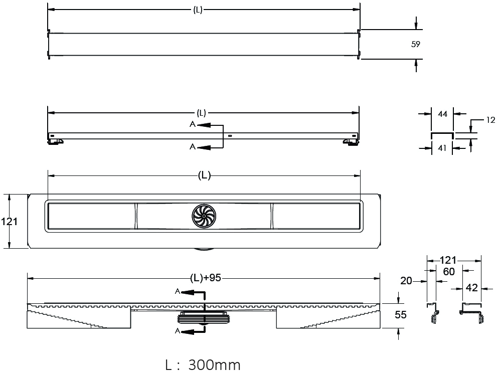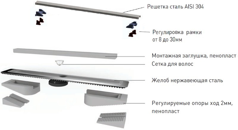 - Двусторонняя установка решетки: металл и вклейка плитки с регулировкой по высоте от 8 до 30 мм.