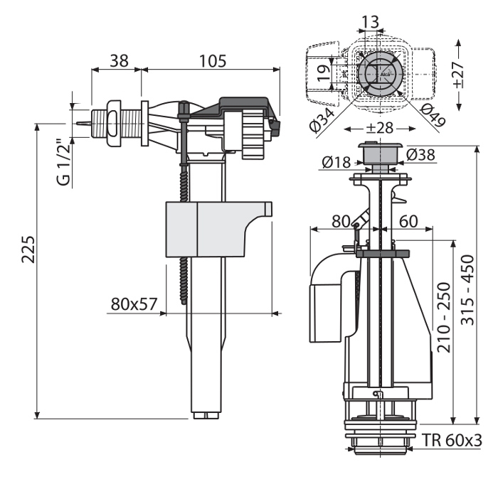 Выпускной комплект для унитазных бачков AlcaPlast SA08K 1/2.Технические особенности: