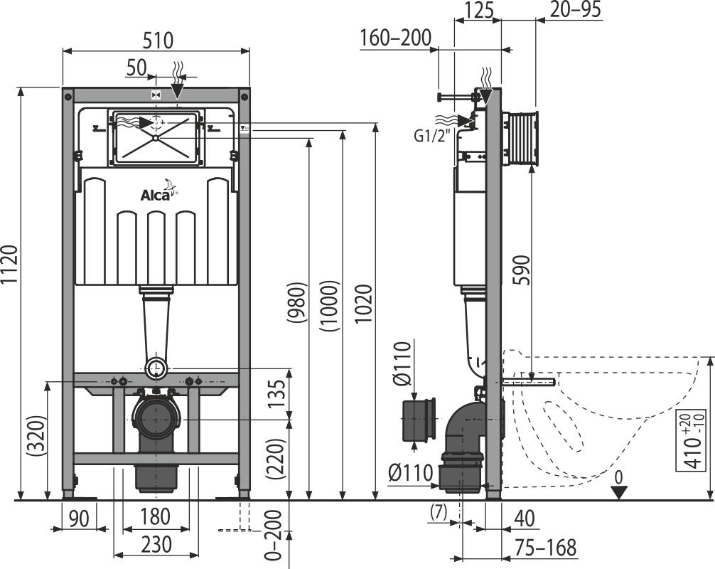 Скрытая система инсталляции для пола с толщиной стяжки 0-200 мм, для установки подвесного унитаза с интервалом крепления 18 см или 23 см.
