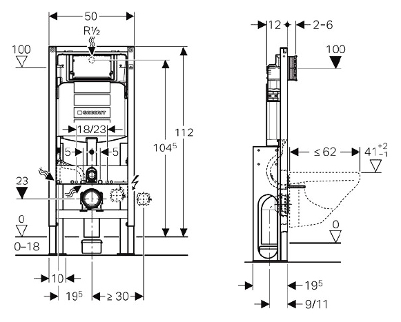 - Расстояние между болтами для монтажа унитаза: 18 или 23 см.