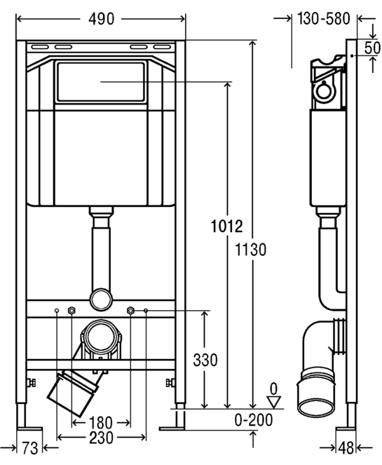 В комплекте поставки: стальная рама с порошковым напылением, смывной бачок Standard 2S с угловым вентилем Rp1/2? клапан заполнения и комплект сливного клапана, эксцентриковый переходник DN90/100 из PP, регулируемое по глубине соединительное колено для подвесного унитаза DN90 из PP, присоединительный комплект для унитаза, крепежный материал для рамы и унитаза (длина настенных креплений 550 мм), для фиксации на металлических каркасных конструкциях в комплект включены саморезы, для крепления на деревянном каркасе - отверстие диаметром 11 мм.