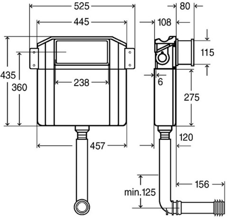 Смывной бачок для скрытой установки для кнопок Visign. Фронтальное управление. Механизм двойного смыва (полный смыв ок. 9 л, 6 л./ малый смыв ок. 3л.). Угловой вентиль, интегрированное резьбовое соединение для воды ВР 1/2, отводное колено, крепеж.