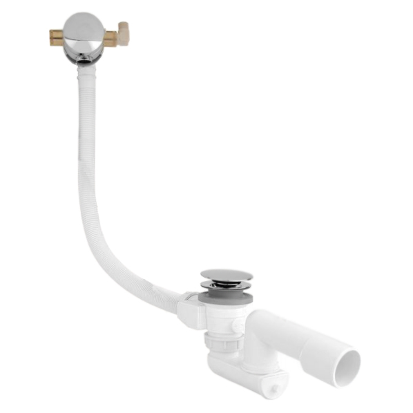 Слив-перелив Ravak X01374 с управлением click-clack, с функцией наполнения ванны переливом. Хромированные декоративные накладки перелива и пробки. Гидрозатвор с вращающимся коленом. Диаметр сливной трубы 40/50 мм. Высота от слива до центра перелива 370 мм. Гибкая пластиковая гофротруба системы перелива длиной 570 мм. Чтобы легко определить нужную длину шланга перелива, нужно сложить высоту и длину от слива до перелива.