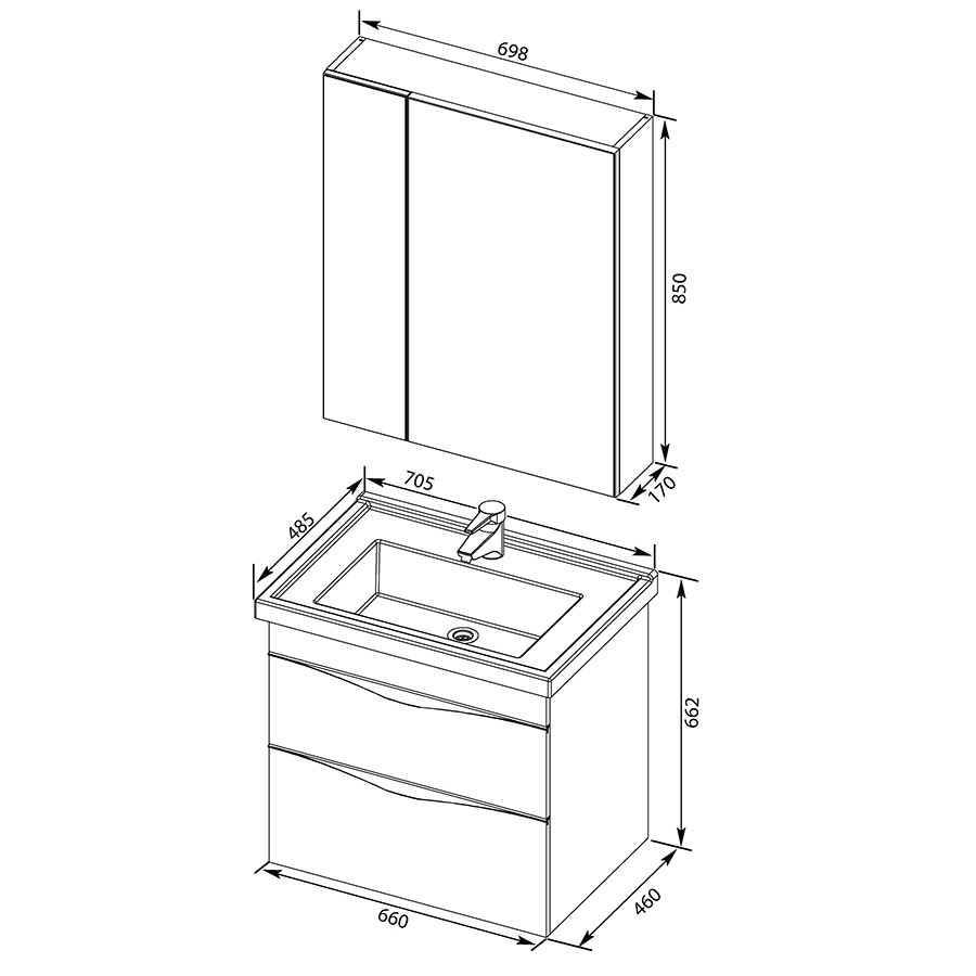В комплекте поставки: тумба, раковина, зеркало.
