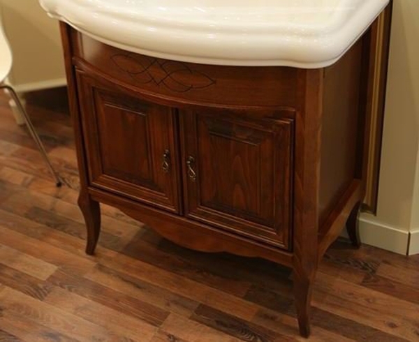 Выполнен в классическом стиле с плавными изогнутыми формами и изящными слегка гнутыми ножками. Фасадные элементы украшены резными узорами, зеркало с лазерной гравировкой.