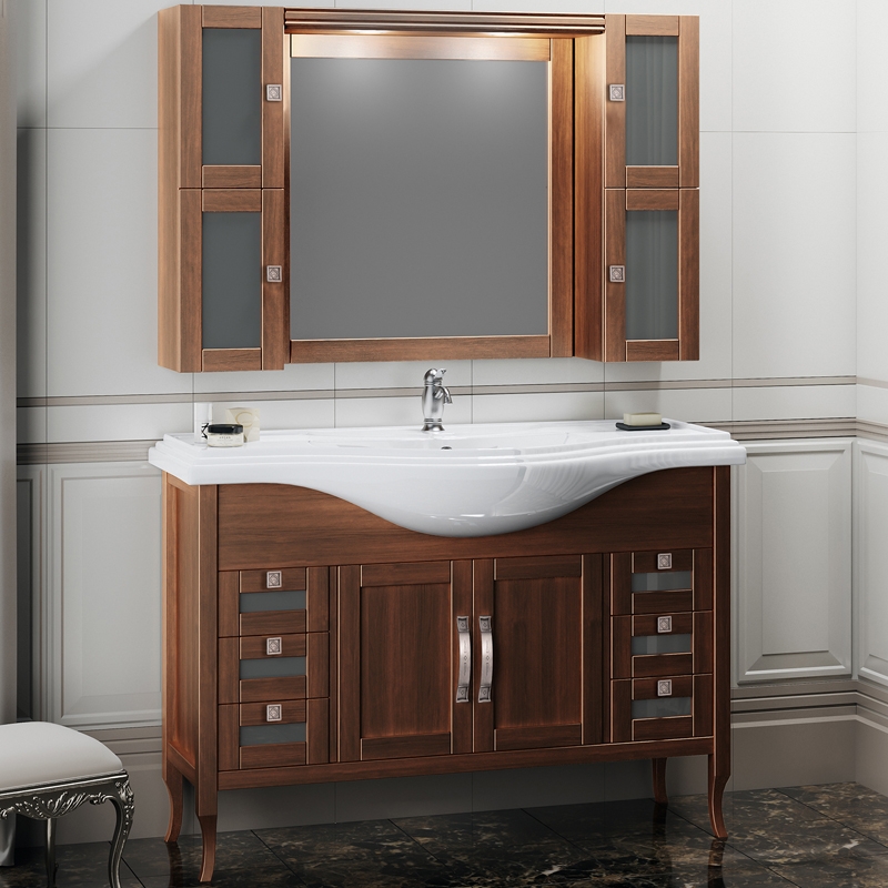 В комплекте поставки: тумба, раковина (фаянс), зеркало, козырек с подсветкой, шкаф (2 шт.).