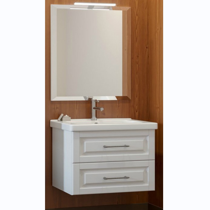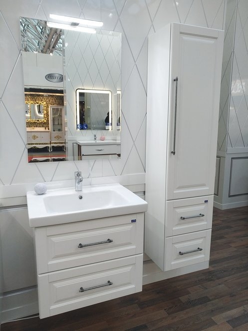 Компактная мебель с уютным и функциональным дизайном. Фасады выполнены с декором в виде рамной фрезеровки. Идеально подходит для небольших ванных комнат.