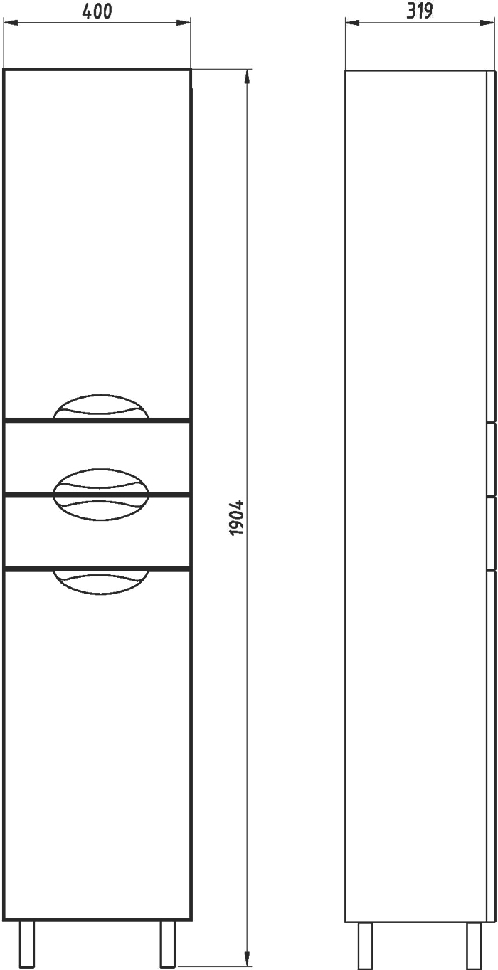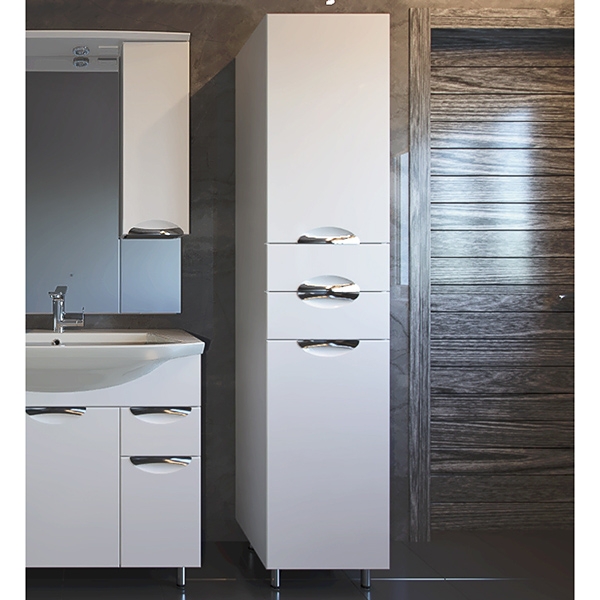 Шкаф-пенал АСБ-Мебель Мессина 40 9625 R - белый, с глянцевой поверхностью. С двумя дверцами и двумя ящиками. Механизм доводчика обеспечит плавное закрывание дверок и ящиков. Выполнен в современном стиле и дополнит большинство интерьеров ванных комнат.