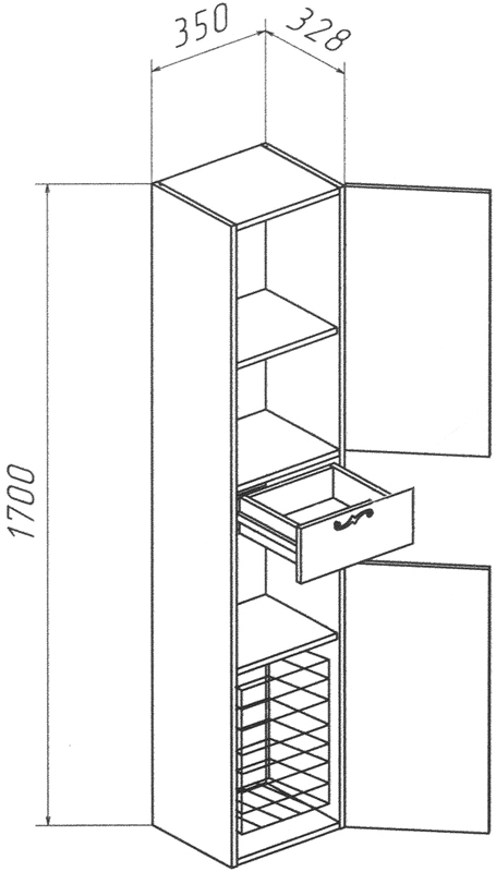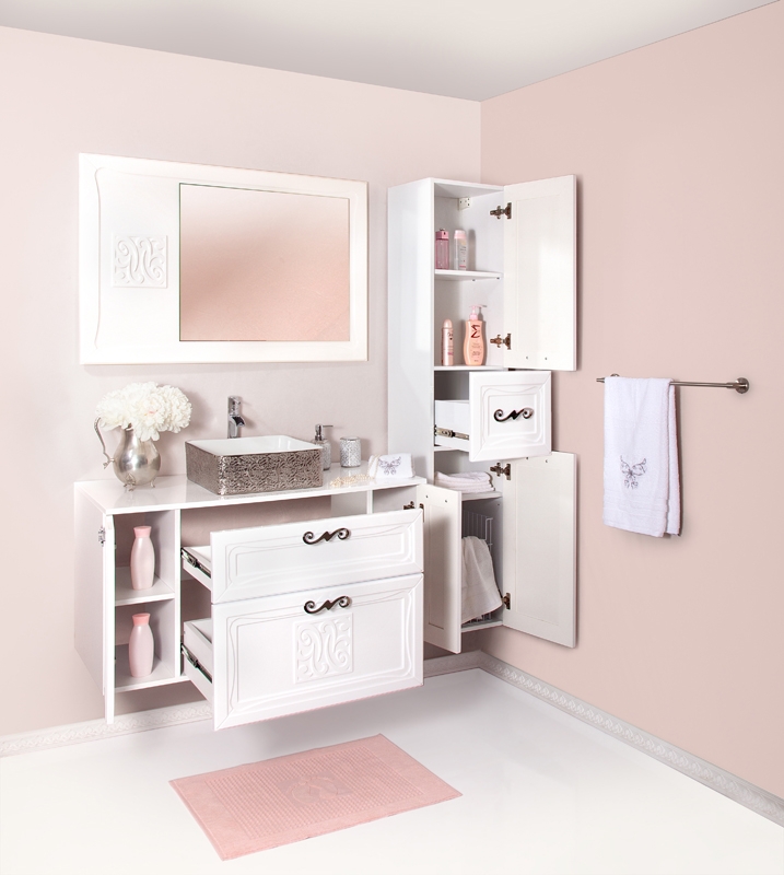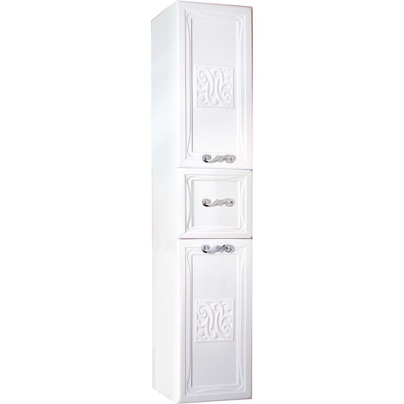 Шкаф пенал Бриклаер Адель 34 с бельевой корзиной, распашной дверцей и выдвижным ящиком выполнен в стилистике прованс с плавными изгибами декора, подчеркнутыми нарочито прямоугольными формами корпуса.