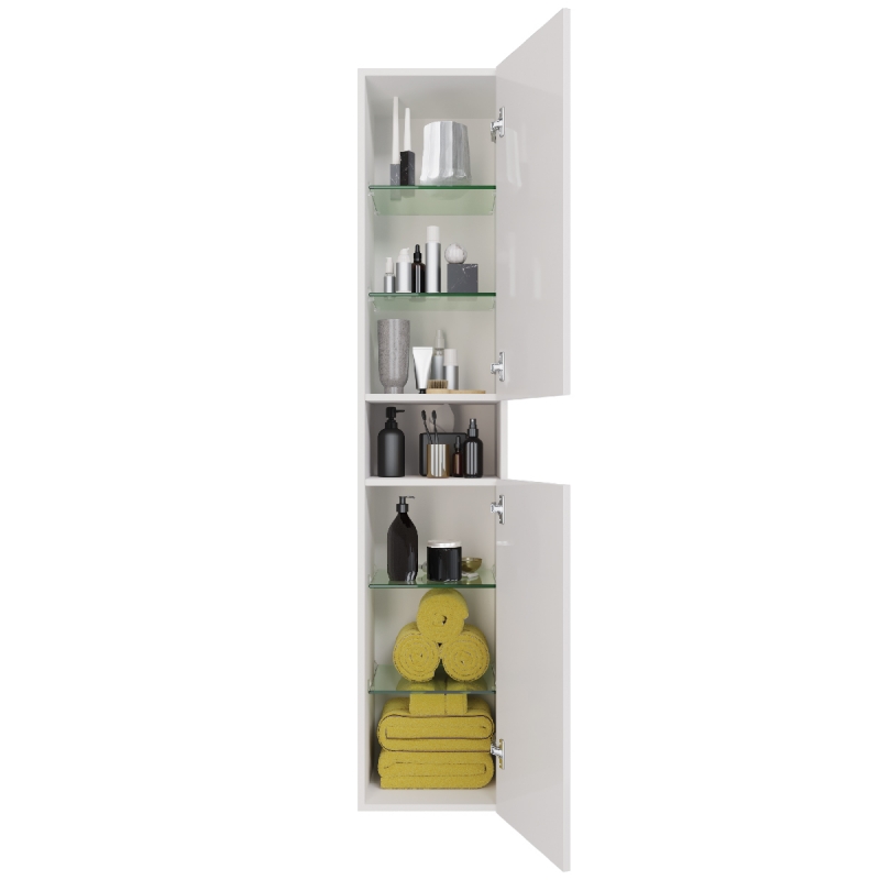 Шкаф с распашными дверками, внутри стеклянные полочки. Петли оснащены доводчиками для плавного и тихого закрывания.