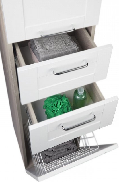 Шкаф-пенал Iddis Sena 36 SEN3600i97 с двумя ножками, с корзиной для белья. Предназначен для использования в ванных комнатах с повышенной влажностью. Влагостойкие материалы повышенной плотности. Высококачественные немецкие скрытые направляющие и петли с доводчиками плавно и бесшумно закрывают дверцы и ящики.