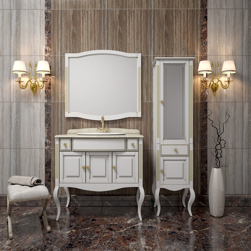 Выполнен в классическом стиле с плавными изогнутыми формами и изящными гнутыми ножками. Фасадные элементы украшены резными узорами. Особую роскошь добавляют ручки инкрустированные кристаллами Swarovski.