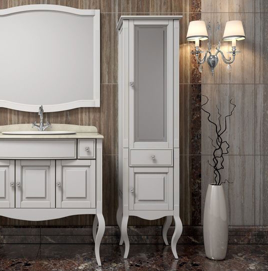Выполнен в классическом стиле с плавными изогнутыми формами и изящными гнутыми ножками. Фасадные элементы украшены резными узорами. Особую роскошь добавляют ручки инкрустированные кристаллами Swarovski.