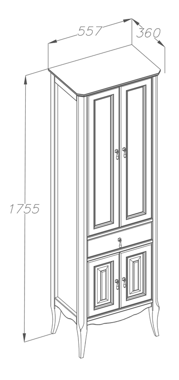 Выполнен в классическом стиле с плавными изогнутыми формами и изящными слегка гнутыми ножками. Фасадные элементы украшены резными узорами, стекло матовое с узором.