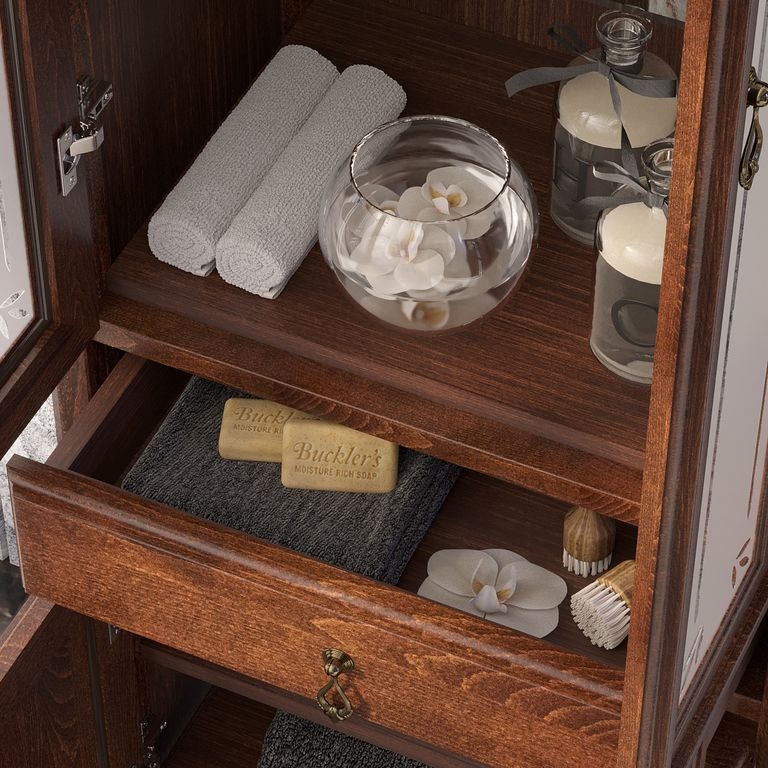 Выполнен в классическом стиле с плавными изогнутыми формами и изящными слегка гнутыми ножками. Фасадные элементы украшены резными узорами, стекло матовое с узором.
