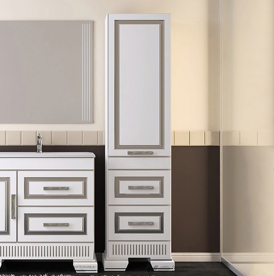 Станет шикарным элементом в интерьере ванной комнаты. Превосходно подходит как для классического, так и для современного стиля. Роскошный фасад выполнен с глубокой фрезеровкой с патиной, а также дополнен удобными ручками-скобами.