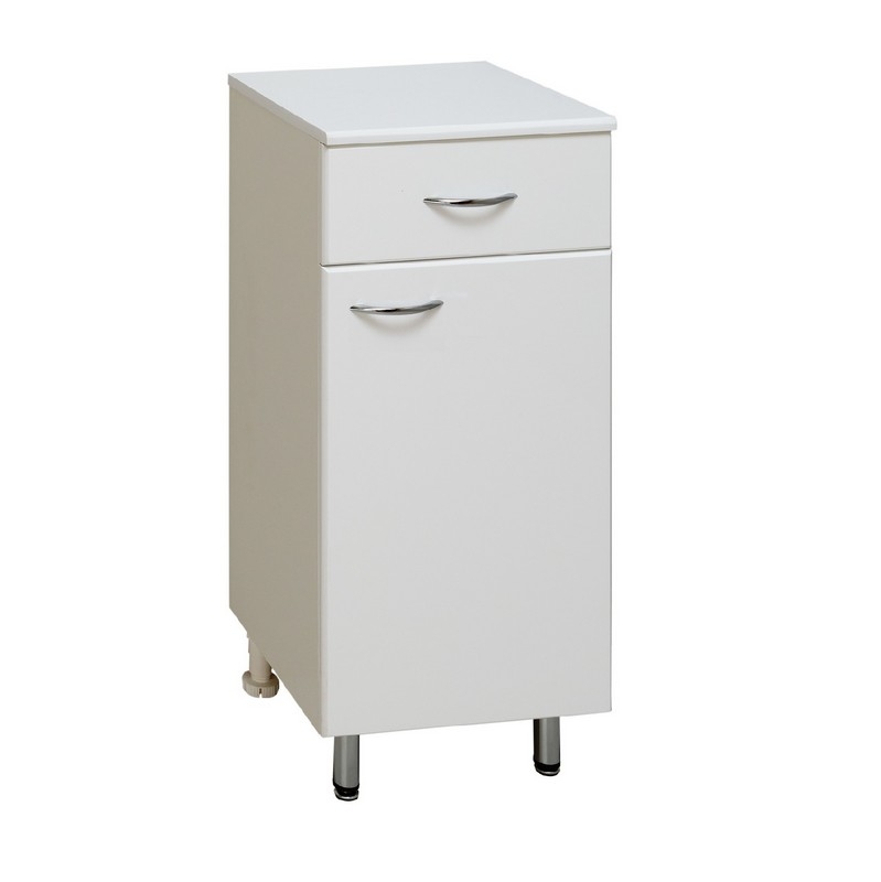 Полупенал Runo Эконом 40 правый напольный с одним выдвижным ящиком и распашным фасадом. В нижнем отделении - одна встроенная полка. Ящик - на шариковых направляющих, петли со встроенным доводчиком, ручки - 2 шт., ножки хром - 2 шт., ножки пластик - 2 шт. Характеристики: