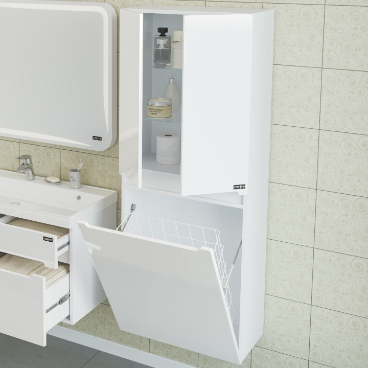 Шкаф пенал СанТа Лондон 60 подвесной с бельевой корзиной Белый