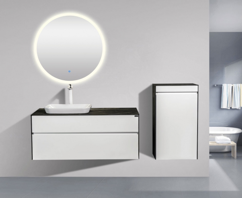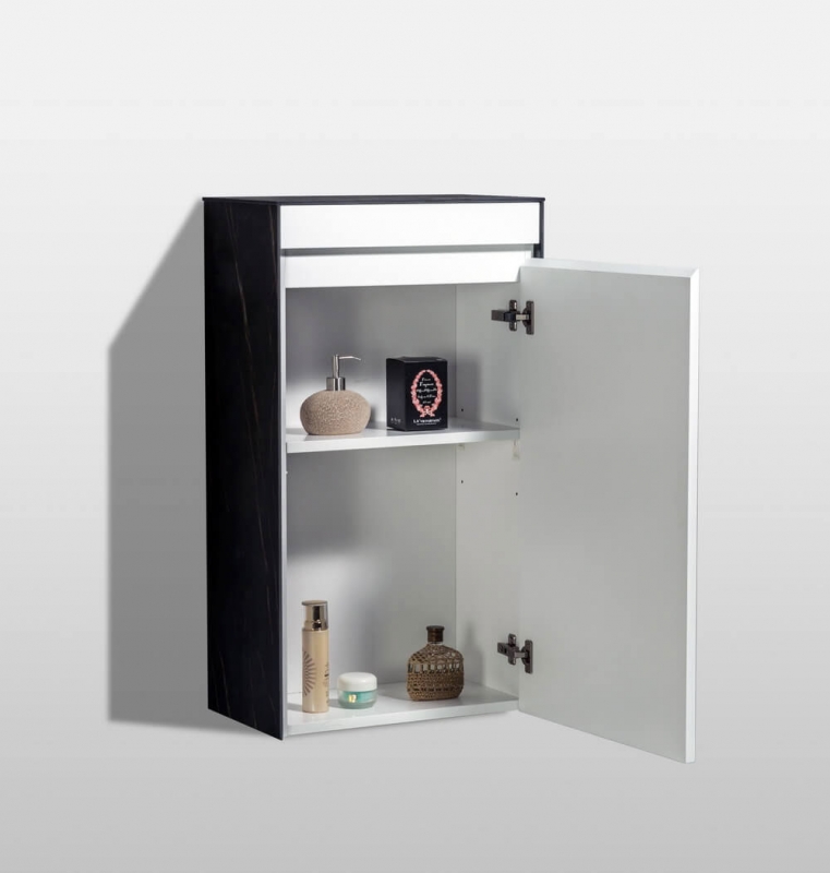 Подвесной шкаф Black&White Universe 50 U907 - уникальное сочетание классического белого цвета и темного с вкраплением изысканного золотого керамогранита по периметру идеально впишется в Ваш интерьер, наполняя комнату нотками роскоши.