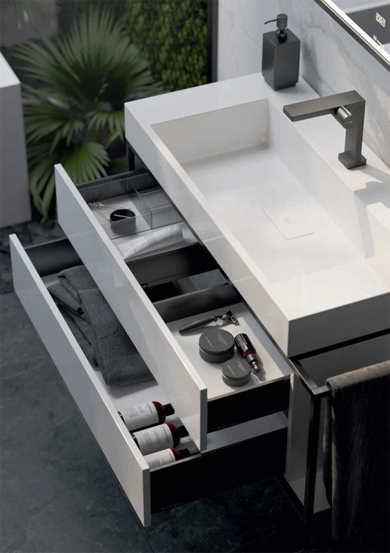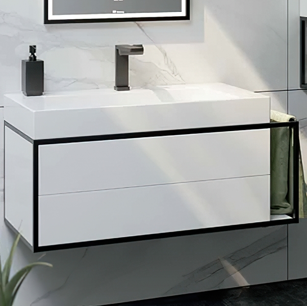 Подвесная тумба под раковину Aqwella Clarberg Logic 80 L LOG0108L с двумя ящиками и дополнительной консолью для полотенец справа. Главная особенность коллекции - это применение алюминиевого анодированного профиля в чёрном цвете.
