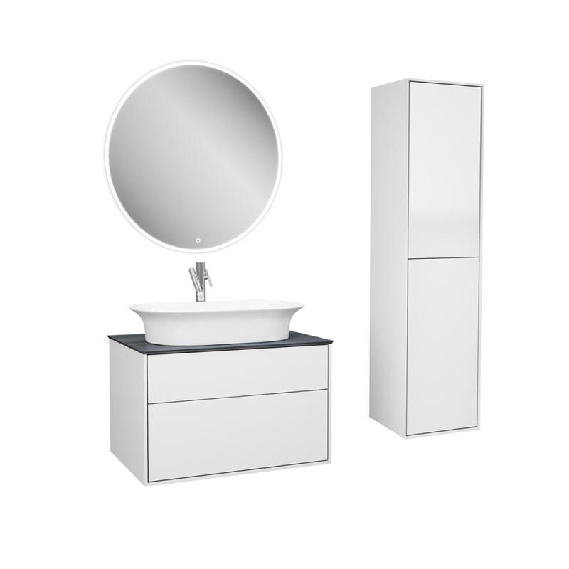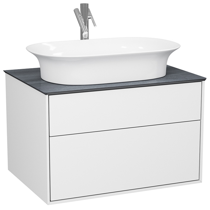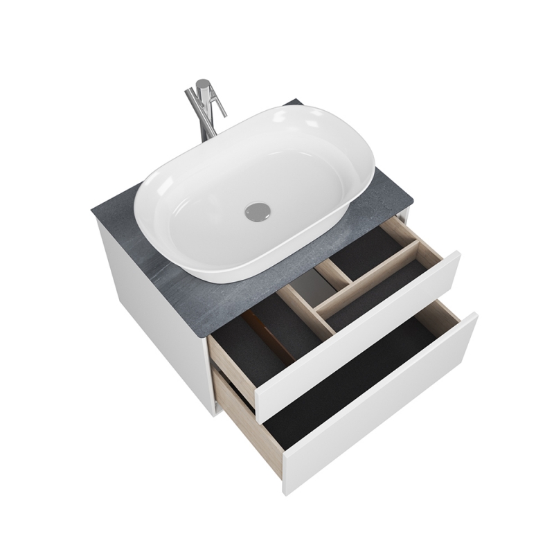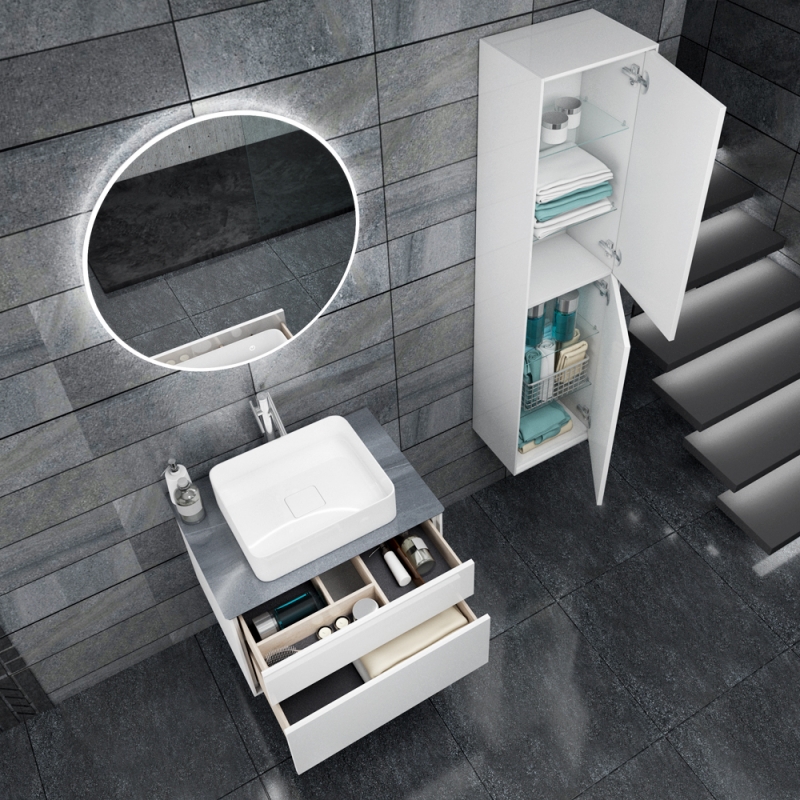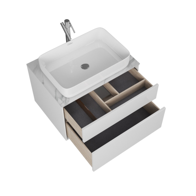 Комплектуется столешницами глубиной 52 см с универсальными отверстиями под смеситель и выпуск. Это позволяет установить на эту коллекцию абсолютно любую накладную раковину.