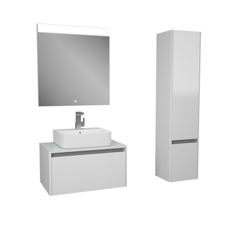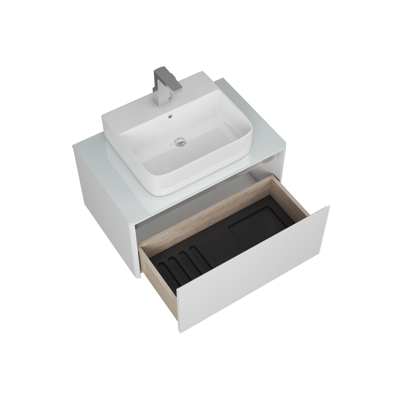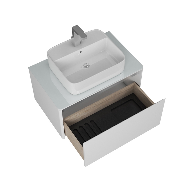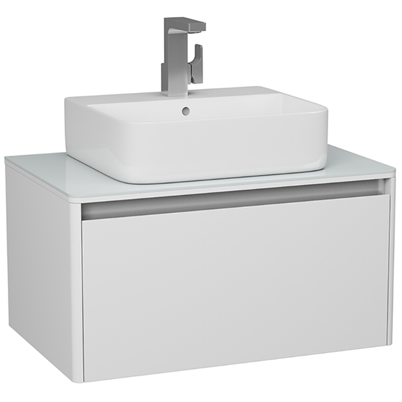 Подвесная коллекция Hanna с одним ящиком создана специально для узких накладных раковин на столешницу, а так же для накладных раковин с отверстием под смеситель. Невесомую конструкцию тумбы, полностью покрашенную белоснежным матовым лаком, стильно дополняет пластина на фасаде из брашированной нержавеющей стали.
