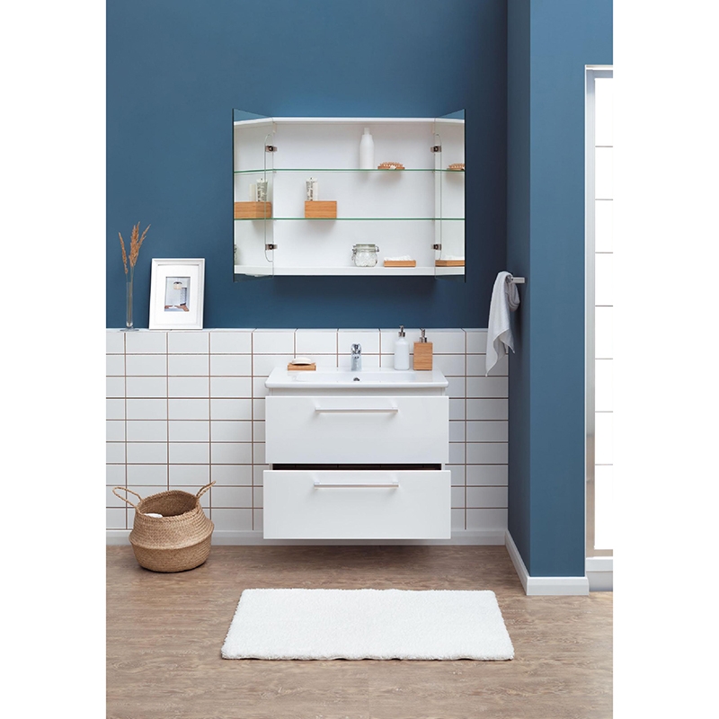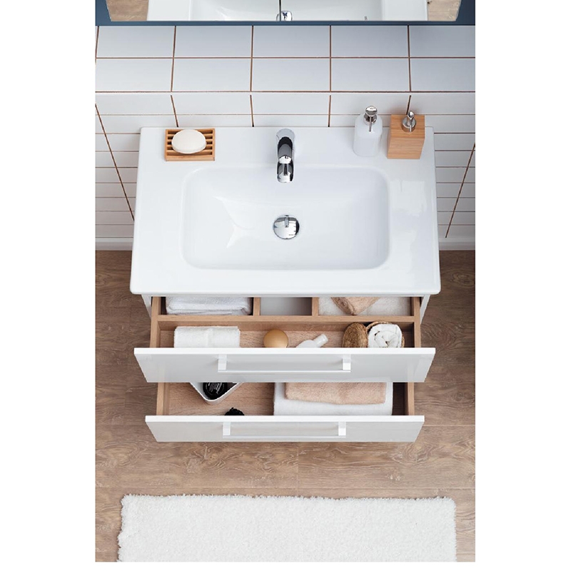 Тумба обрадует двумя одинаково высокими просторными ящиками. Умывальник обладает широкими полями, что позволяет разместить на них туалетные принадлежности.