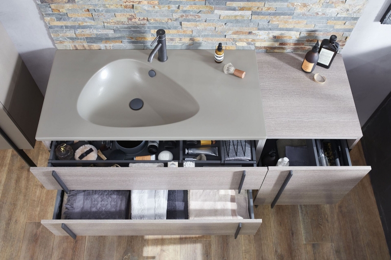 - Тумба оснащена двумя широкими и одним боковым (ширина 45 см) выдвижными ящиками с механизмом плавного и бесшумного закрытия.