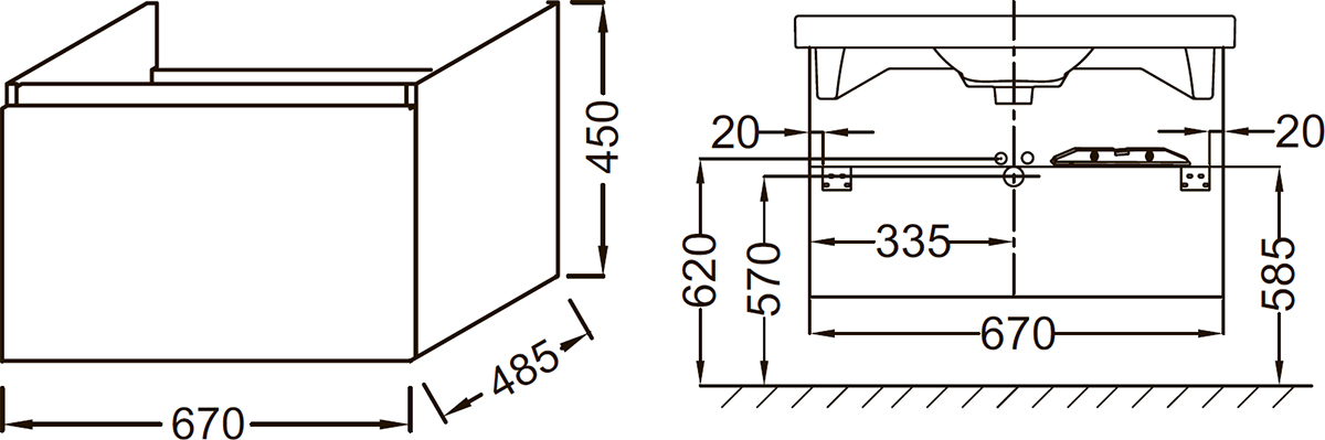 - Габариты корпуса тумбы (ШхВхД): 67x45x48,5 см.