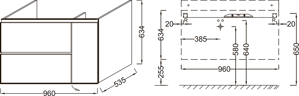 - 2 выдвижных ящика и распашная дверца с механизмами плавного закрытия.