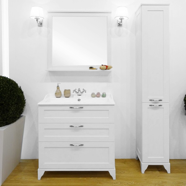 Тумба под раковину Акватон Леон 80 Н 1A187801LBPS0 на двух ножках, с тремя выдвижными ящиками, оснащенными системой плавного закрывания, с двумя усиленными кронштейнами для подвески. Корпус и фасад выполнены из МДФ, который обладает повышенной влагостойкостью и сопротивляемостью износу, не выделяет вредных испарений, хорошо выдерживает воздействие бытовых химических средств, за исключением абразивных материалов и едких веществ, и жидкостей. Отделка: пленка с фактурой под натуральное дерево.