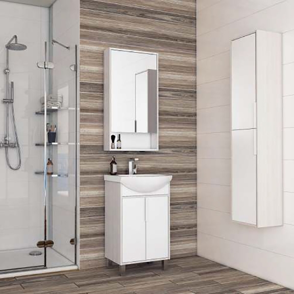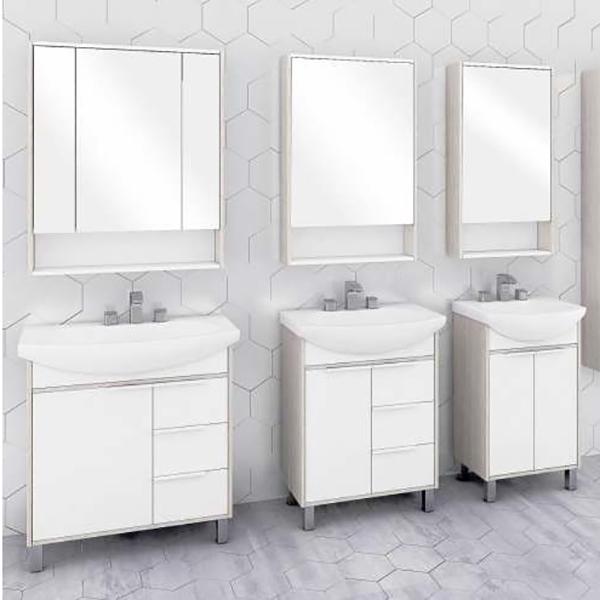 Белоснежный цвет фасадов в сочетании со вставками и боковыми стенками Ясень фабрик придадут вашей ванной комнате ощущения свежести и уюта. Благодаря лаконичным белым ручкам на тумбе и отсутствию лицевой фурнитуры на шкафчике коллекция универсальна, впишется в любую ванную комнату.