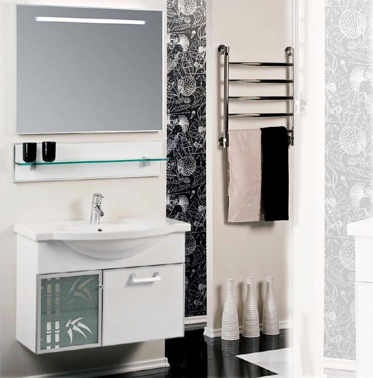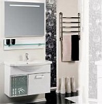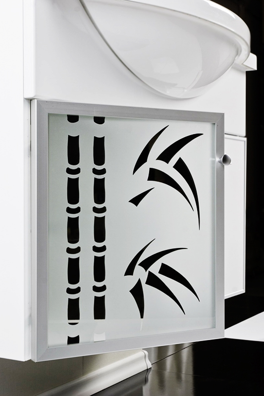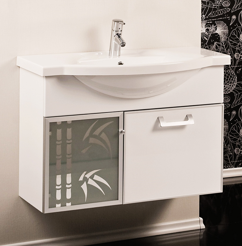 Подвесная тумба под раковину Акватон Сайгон 85 1A105701SA010 с двумя регулируемыми навесами, с одной распашной дверцей слева и с одним выдвижным ящиком справа. Дверца украшена стеклом с зеркальным рисунком в виде бамбука. Фасады окантованы алюминиевым профилем. Корпус выполнен из ДСП с ламинированным покрытием, обладает повышенной влагостойкостью и сопротивляемостью износу, не выделяет вредных испарений, хорошо выдерживает воздействие бытовых химических средств, за исключением абразивных материалов и едких веществ, и жидкостей. Фасадные детали изготавливаются из МДФ с пятислойной покраской.